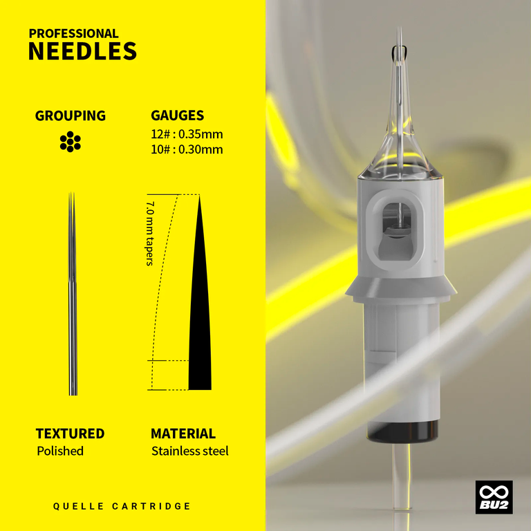 Материал игл – нержавеющая хирургическая сталь 316L. Высоко качественная спайка игл. Высокий контроль качества. С картриджами QUELLE вы сделаете хорошую работу.
